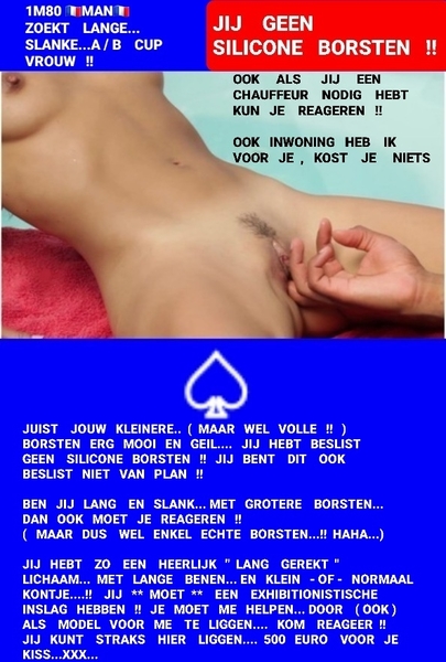 Ben jij slanke lange..A/Bcup Vrouw 21 tot 35 ??Jij GEEN silicone borsten !! Juist jouw kleine...( maar wel VOLLE !! ) Borsten.. erg mooi en geil...